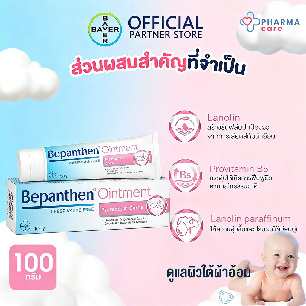 Bepanthen Ointment ออยเมนท์ บำรุงผิว บำรุงผิวแห้งเสีย ดูแลผิวใต้ผ้าอ้อม ปกป้องจากผื่นผ้าอ้อม ปกป้องผิวได้ยาวนาน 100 กรัม