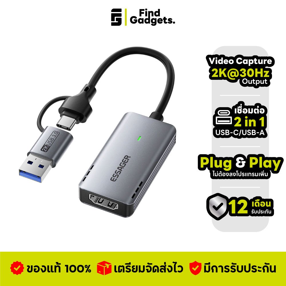 Essager 2in1 USB-A/USB-C to HDMI Video Capture Card 2K@30Hz ตัวแปลงภาพและเสียงจาก HDMI สำหรับบันทึกหรือสตรีมสด