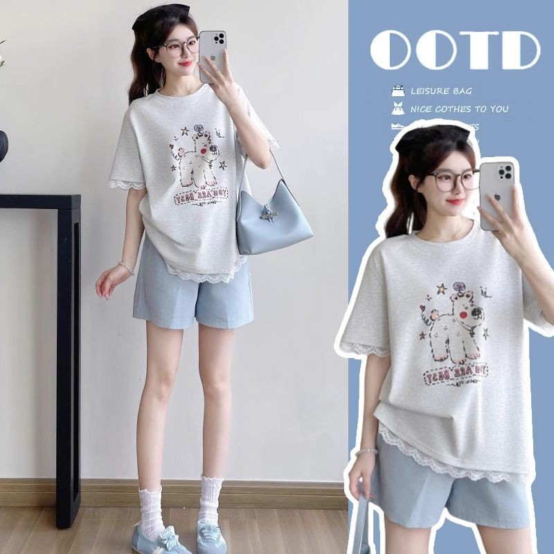 แฟชั่นหญิงตั้งครรภ์ชุดสองชิ้นตั้งครรภ์สูทแขนสั้นหญิงตั้งครรภ์ด้านบน + กางเกงขาสั้นตั้งครรภ์
