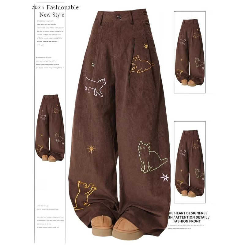 กางเกงขากว้างดีไซน์ลายทางปักแมวน่ารัก