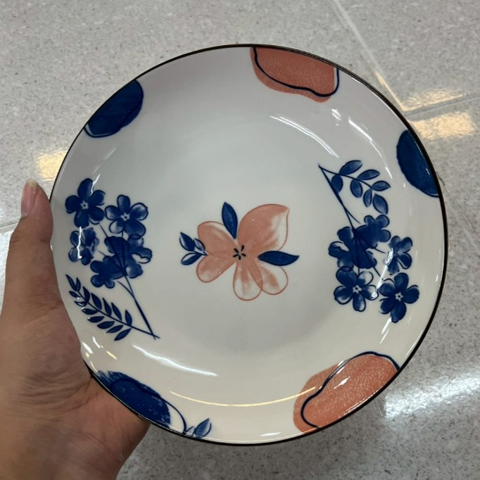 จานเซรามิก 8 นิ้ว จานข้าว ยกขอบ ลายดอกไม้น้ำเงินชมพู ทำจากเซรามิกเนื้อดี เข้าไมโครเวฟได้