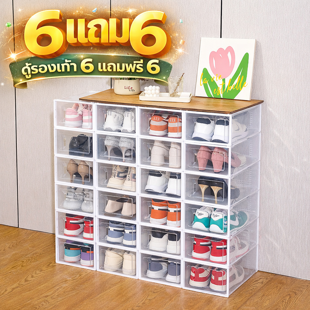 [ 6 แถม 6 ] กล่องรองเท้า กล่องใส่รองเท้า พับได้ ประกอบง่าย กันน้ำ กันฝุ่น กล่องพลาสติกใส่ของ เคลมฟรีหากมีปัญหา มีส่งด่วน