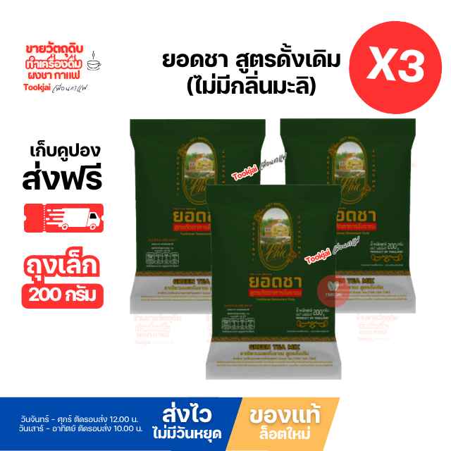 ชาเขียวยอดชา สูตรดั้งเดิม มีคูปองส่งฟรี (มีส่งด่วน Express) (แพ็ค 3 ห่อ) 200 กรัม **ส่งทุกวันไม่มีวันหยุด