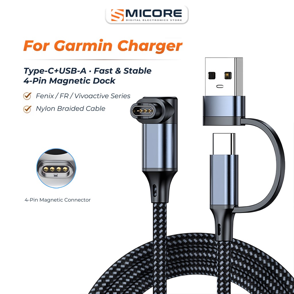 สายชาร์จ Garmin 4-Pin 2-in-1 USB-A/Type-C เสถียร ปลอดภัย สายถักทน รองรับ Forerunner 245/265 Fenix 7
